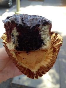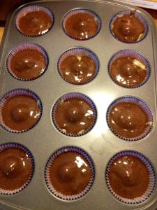 Now, add a scoop of the other batter (this time was devil’s food cake batter for me). Try not to overfill the cupcake liners. To be honest, I was not as consistent as I would have liked but I filled them between 2/3 and 3/4 full and they came out great. Should look like this (excuse my messiness):