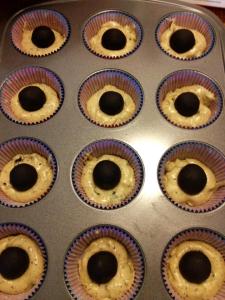 6. Scoop the second mixture into all of the liners. Again, I would go for about 1 oz or a little less than 1/3 of the entire cupcake liner. The truffle should be covered in the second batter but still visibly sticking out.